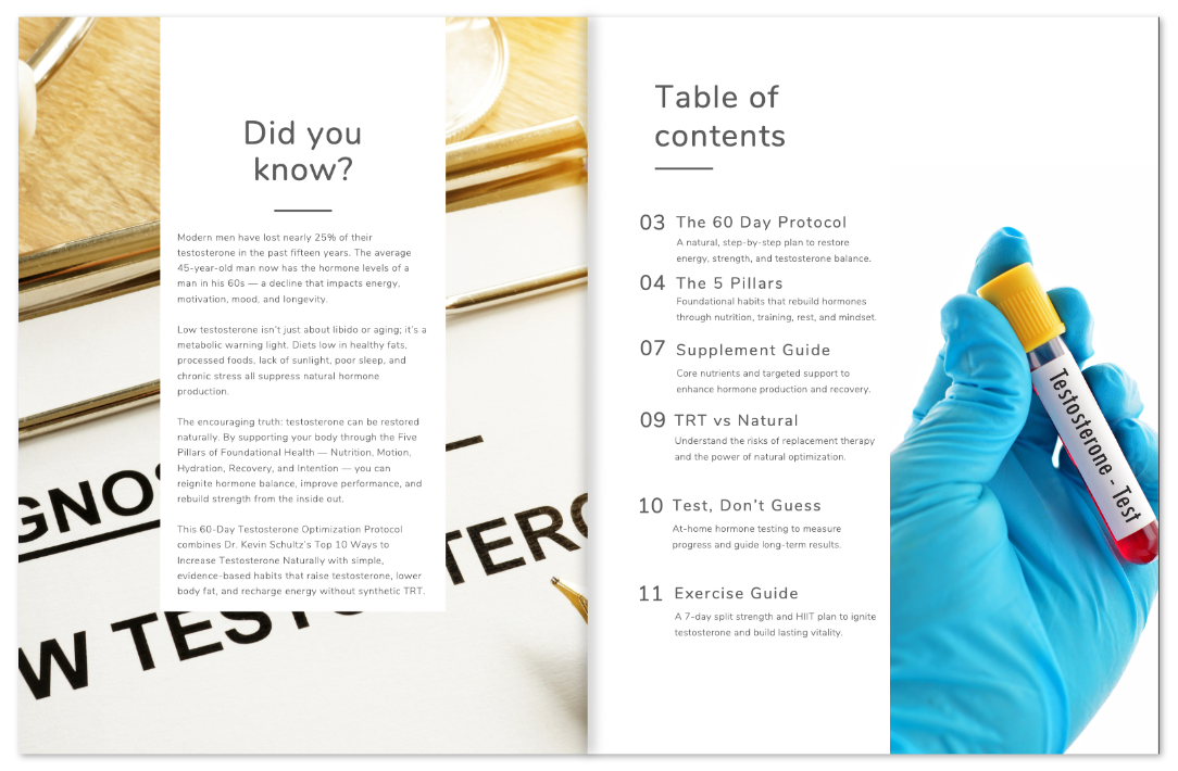 This 60-day protocol is designed to help you increase your testosterone levels and reverse low T naturally—through diet, exercise, and lifestyle practices. No TRT necessary.